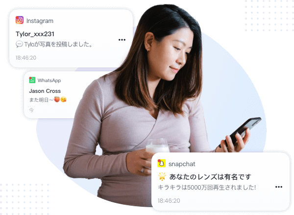 AirDroid Parental Controlでは、テキストメッセージ、ソーシャルメディアアラート、アプリのアップデート、着信通知など様々な通知を監視することができ、お子さんのデジタルでのやり取りについて常に情報を得ることができます。