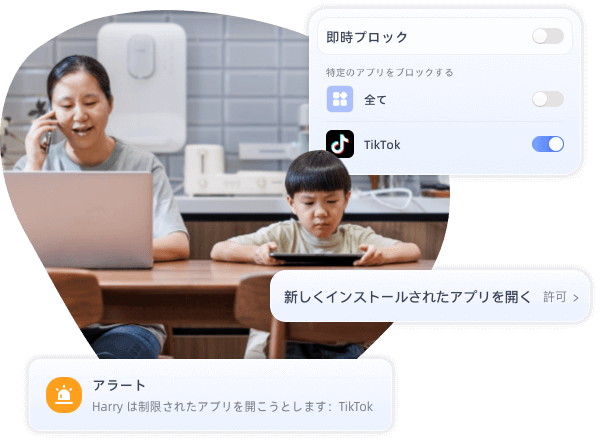 - お子様がブロックされたアプリにアクセスしたり、新しいアプリをインストールしようとしたら、リアルタイムのアラートでお知らせします。