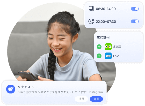 - 特定のアプリをホワイトリストとして許可し、お子様の学習と娯楽の間でバランスの取れた自由を確保します。